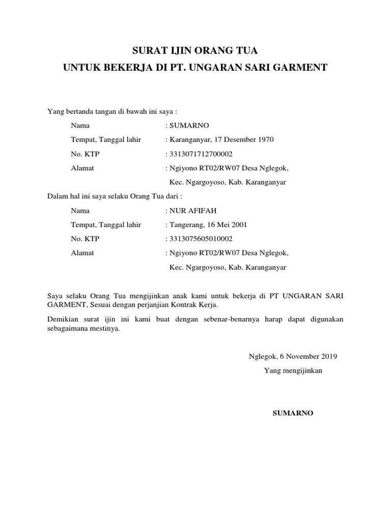 Jalan terusan pasir koja, gang pak sumardi no.84/194a rt 01 rw 05, kelurahan sukahaji, kecamatan babakan. Bahwa saya mengetahui dan mengizinkan anak saya mengikuti pendidikan gemapala di stai bbc. Savesave surat ijin orang tua.docx for later. Bandung, 16 maret 2015 orang tua / wali. Surat ijin orang tua/suami/istri adalah surat yang digunakan/dikeluarkan untuk melengkapi persyaratan melamar pekerjaan baik di dalam negeri maupun di luar negeri, surat ijin orang tua apabila yang bersangkutan belum berkeluarga.